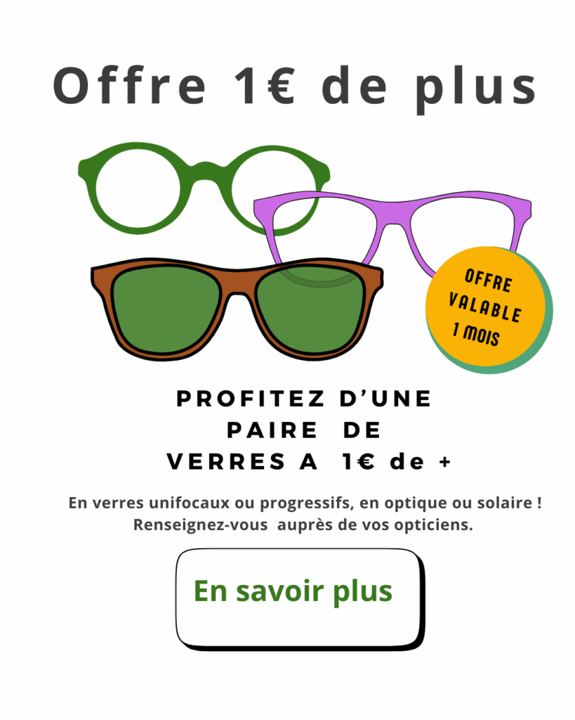 Chez « les opticiens JOANNY » vous pouvez bénéficier de cette offre aussi bien pour des verres unifocaux que progressifs. De plus, on peut « Prendre son temps ! » et choisir plus tard son deuxième équipement, l’offre est valable 1 mois.
